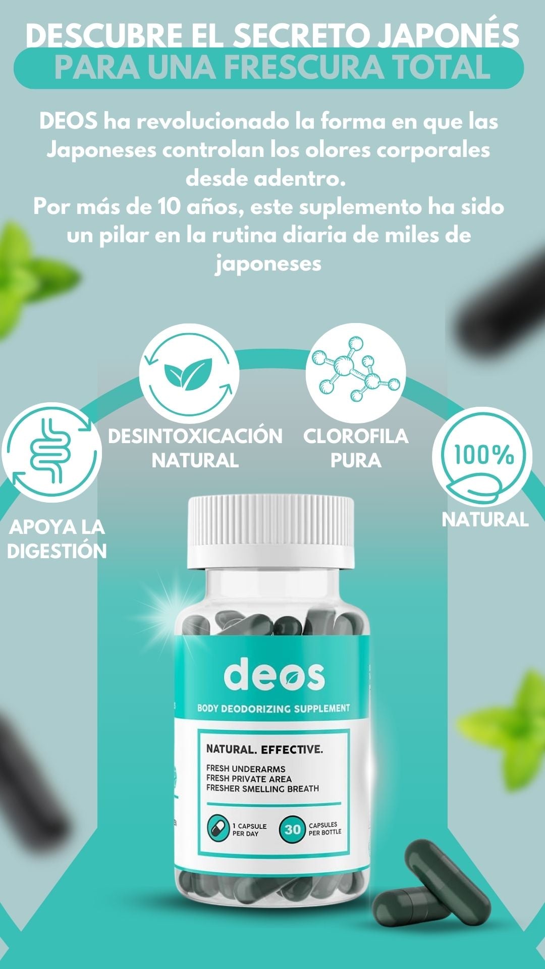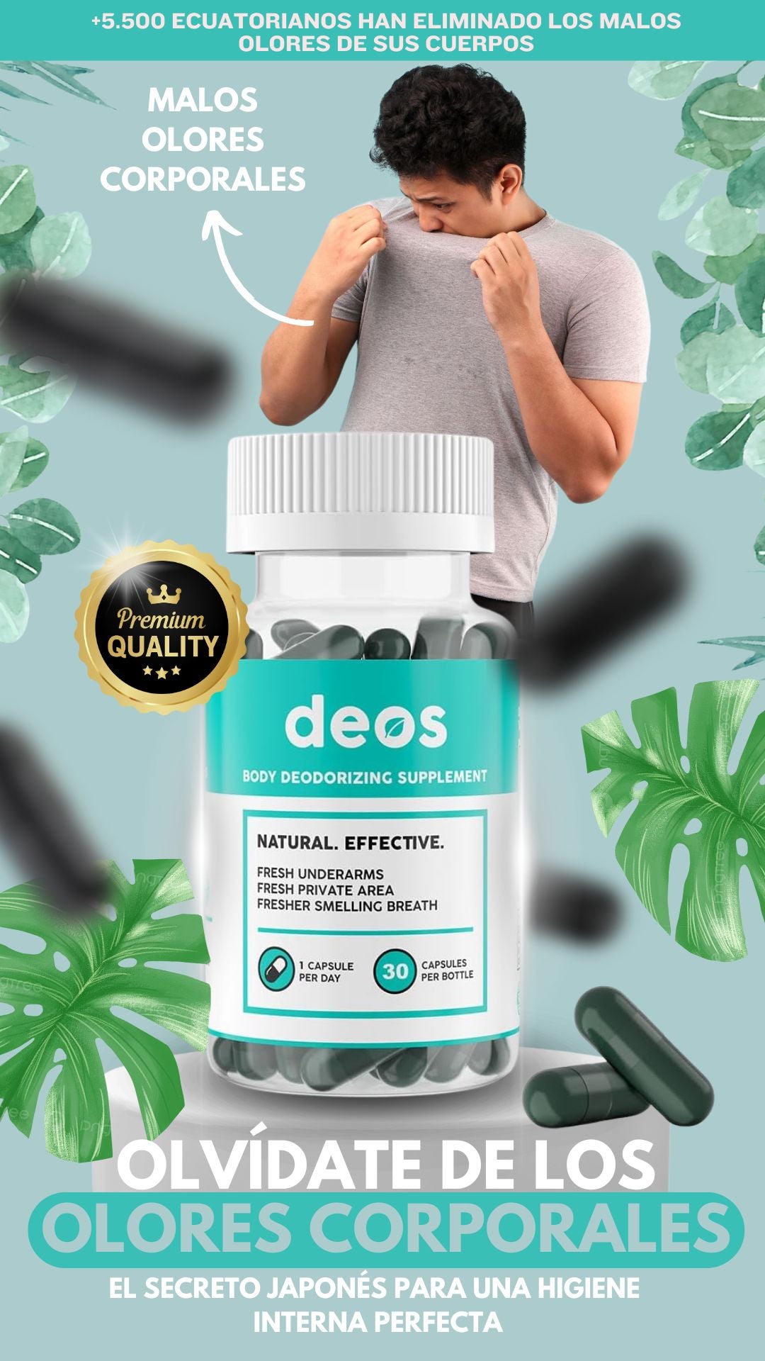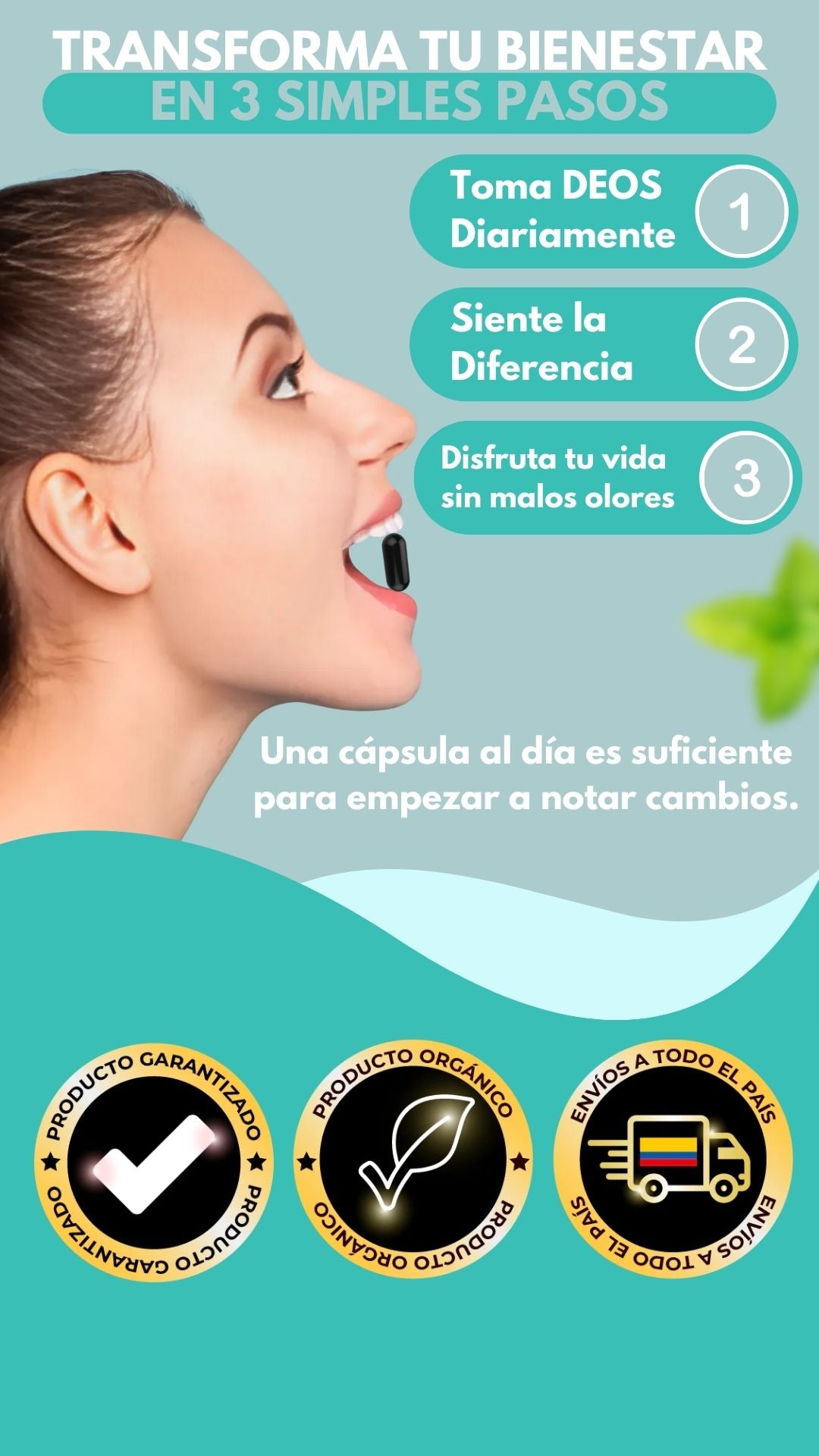 DEOS actúa desde el interior del cuerpo, ayudando a neutralizar los compuestos que causan mal olor en el aliento, axilas, pies y zona íntima.