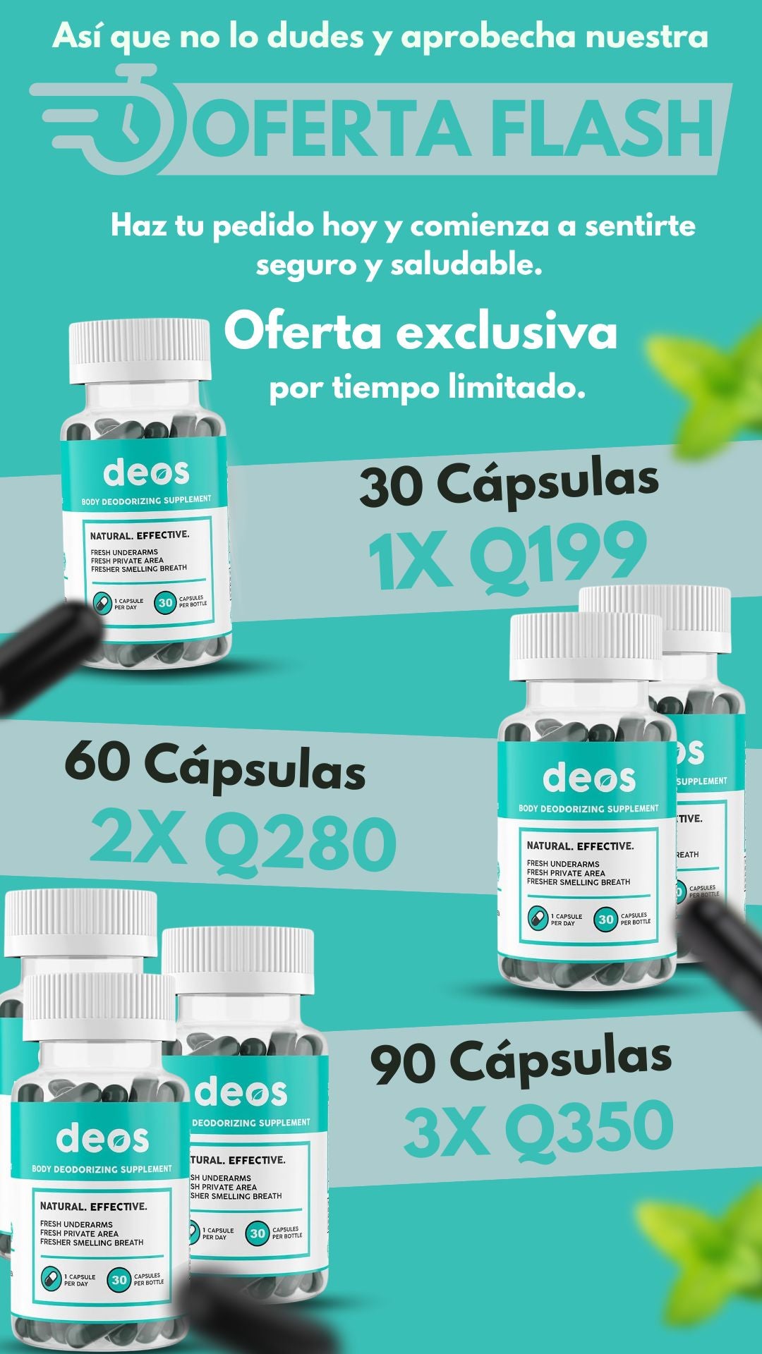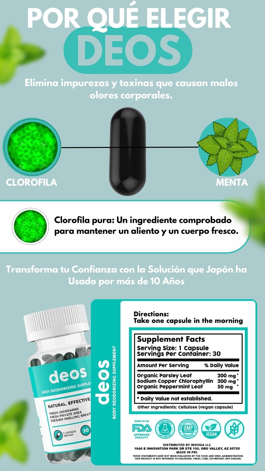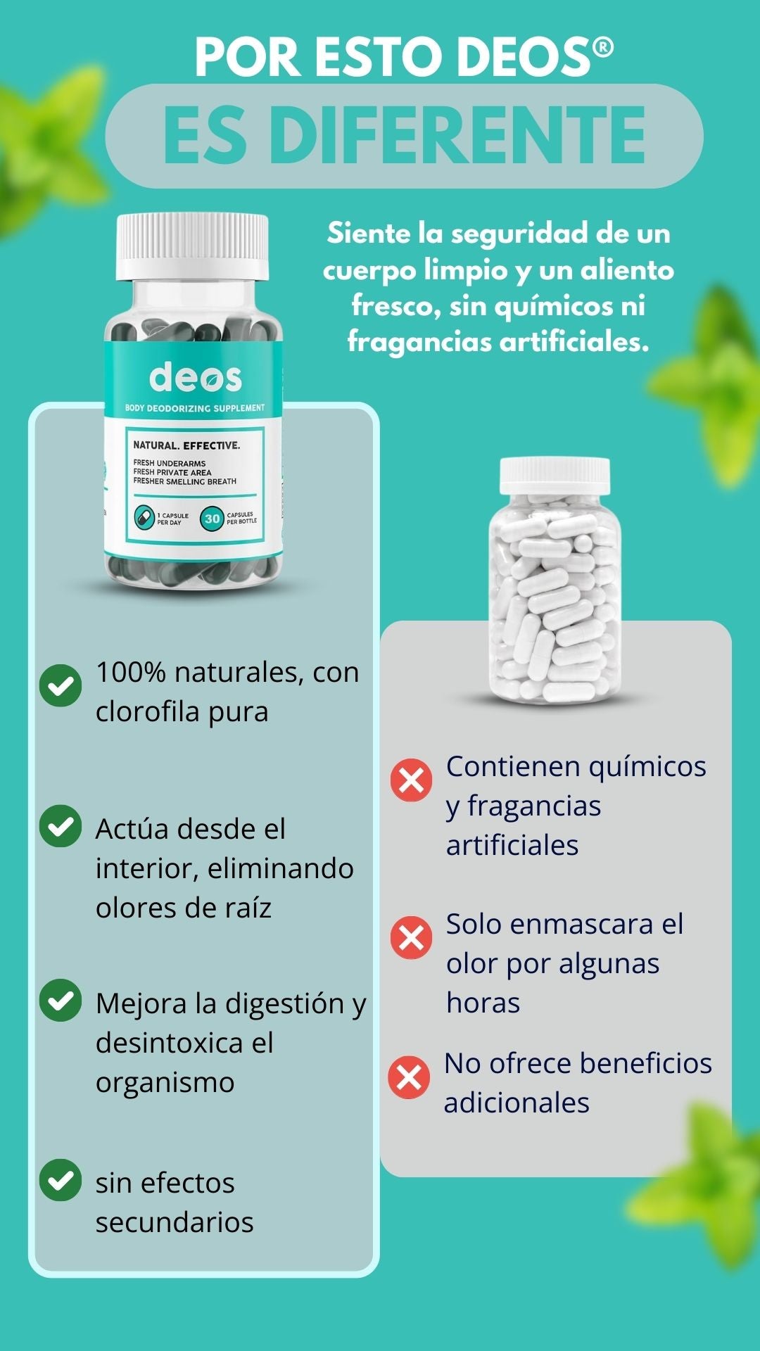 DEOS actúa desde el interior del cuerpo, ayudando a neutralizar los compuestos que causan mal olor en el aliento, axilas, pies y zona íntima.