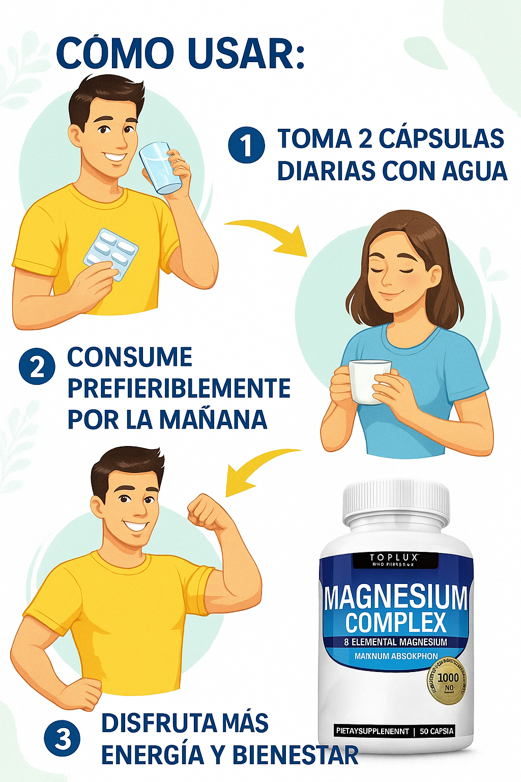 Se recomienda tomar 2 cápsulas al día con un vaso de agua, preferiblemente durante el desayuno o antes de dormir.